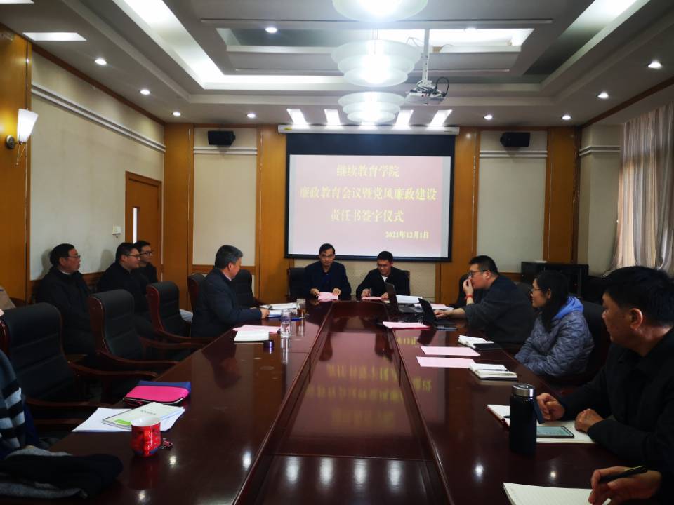 2021年12月1日下午,在北区图书馆301会议室,继续教育学院举行“廉政教育会议暨党风廉政建设责任书签字仪式”。会议及仪式由学院党总支书记陈志华主持,学院全体教职工参加。
