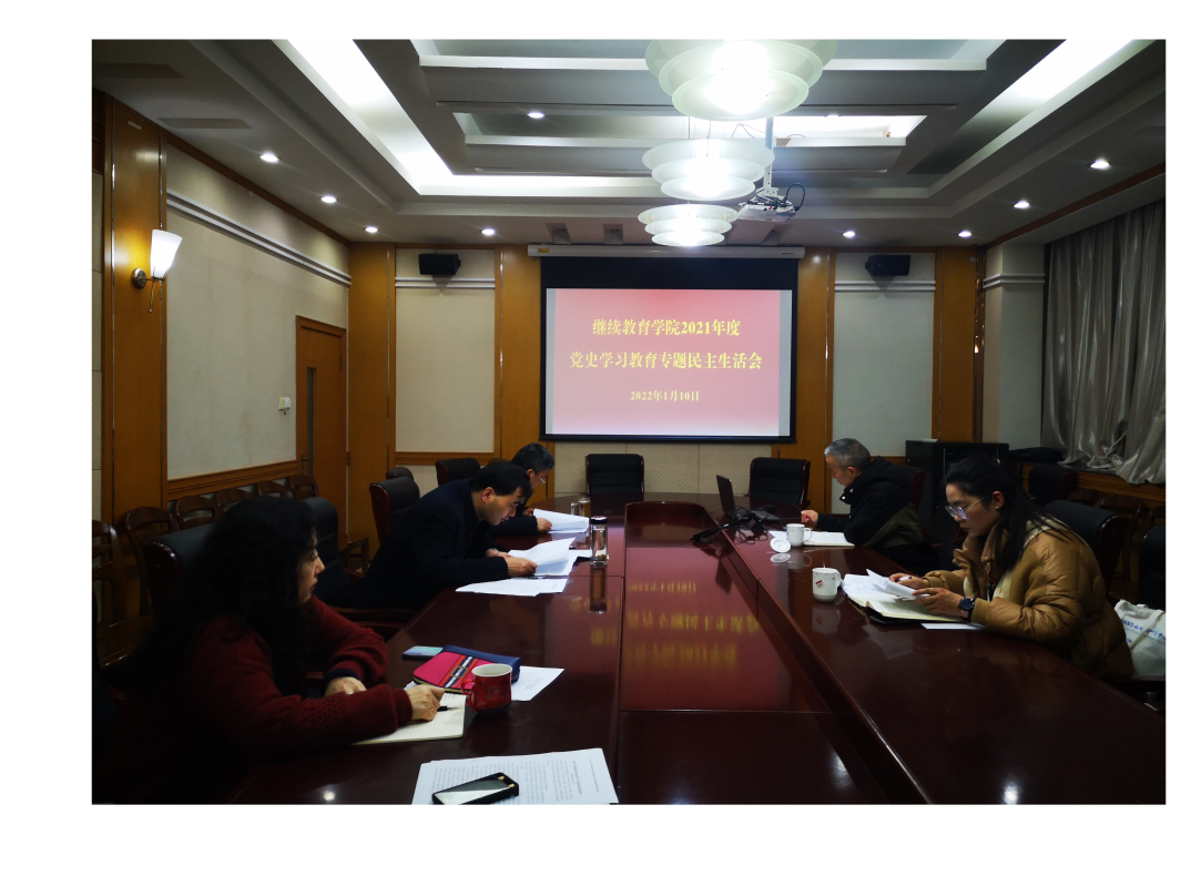 2022年1月10日下午,在北校区图书馆301会议室我院召开了2021年度党史学习教育专题民主生活会,学报编辑部副主任熊璐璐、保卫处国防与军事教研室主任薛俊义代表党史巡学督学第四指导组列席会议,会议由继续教育学院党总支书记陈志华主持。