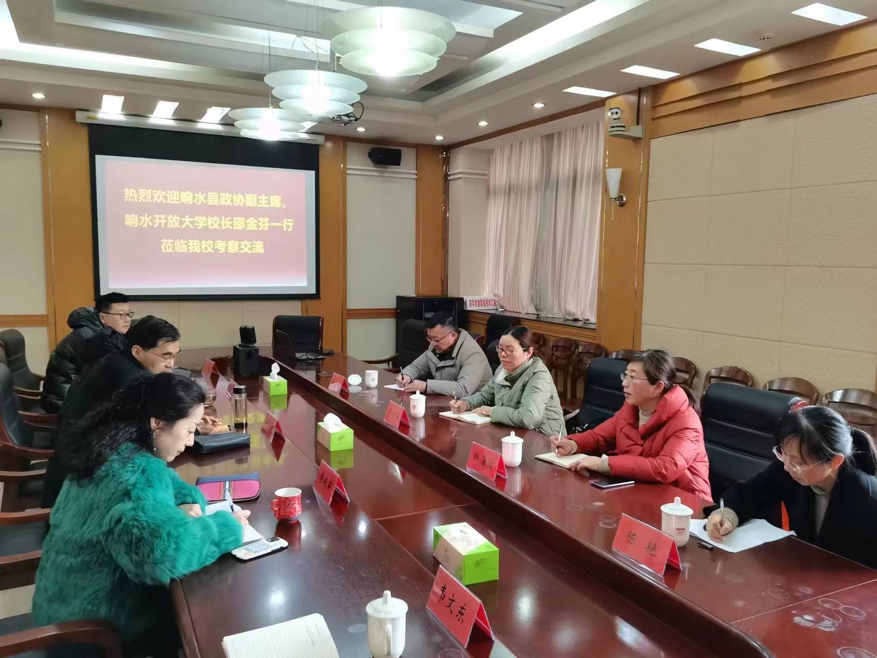 2月13日下午,响水县政协副主席、响水开放大学校长邵金芬,响水开放大学副校长韩海治,副校长姜为俊等一行来我校考察交流。盐城开放大学校长、书记陈志华,副校长夏金海,副校长李晓燕,招生办公室、社会教育服务指导中心相关老师参会,会议由陈志华主持。