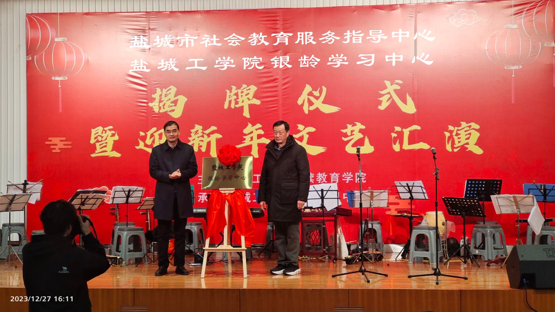 揭牌仪式上,唐红兵、奚新国、陈洁洁、陈志华分别为盐城市社会教育服务指导中心、盐城工学院银龄学习中心揭牌。