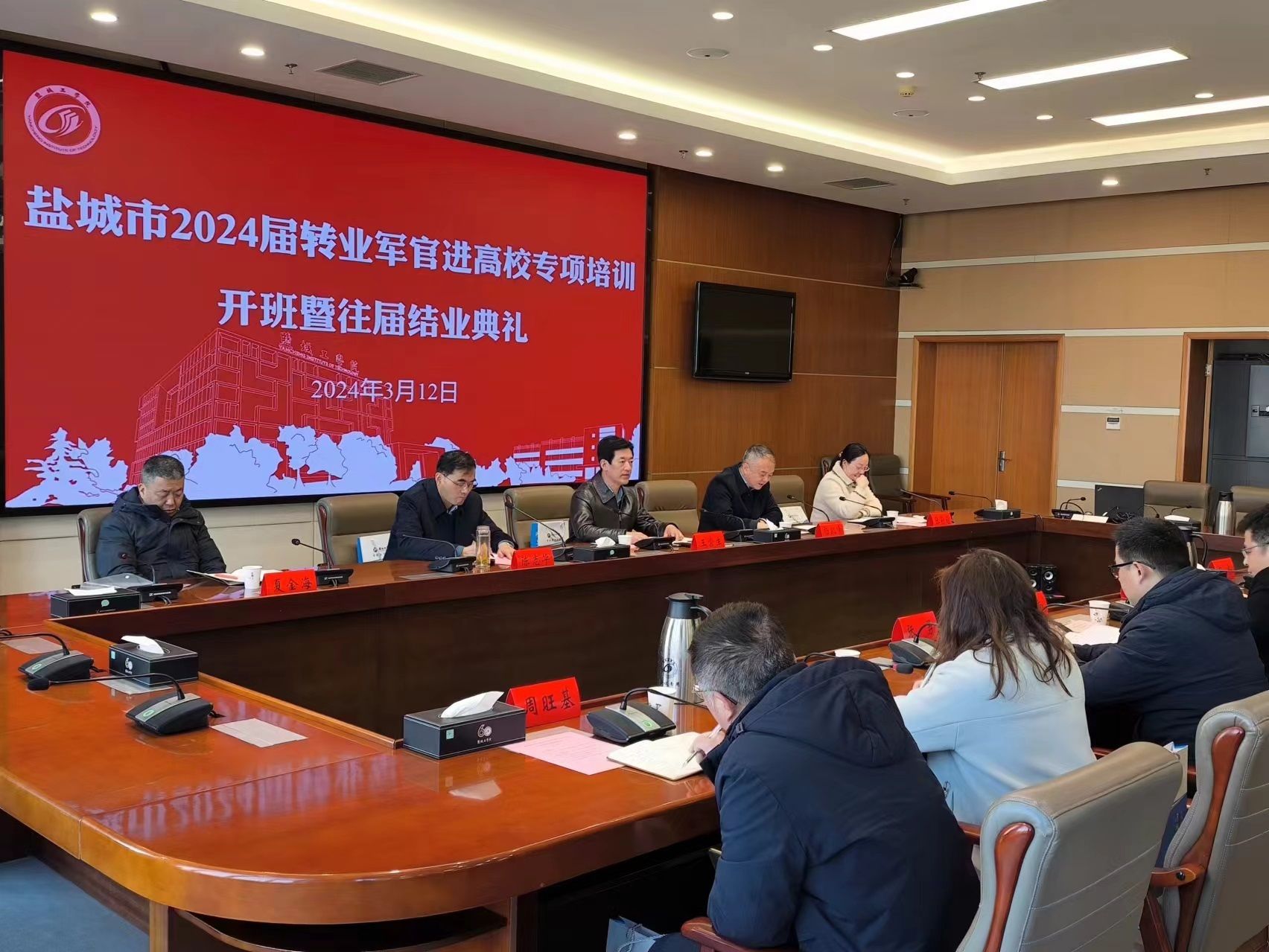 3月12日下午,盐城市2024届转业军官进高校专项培训开班暨往届结业典礼在希望大道校区行政楼9楼视频会议室举行。校党委常委、副校长王资生,盐城市退役军人事务局副局长杨凯峰出席并讲话。亭湖区、盐都区、盐南高新区退役军人事务局负责人,我校承办学院负责人,2023届结业学员,2024届新学员等50余人参加。
