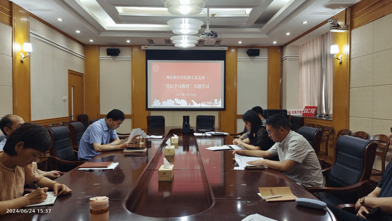 6月24日下午,在北校区图书馆301会议室,学院教工支部开展党纪学习教育专题学习。支部书记朱荪珺主持,全体党员参加。