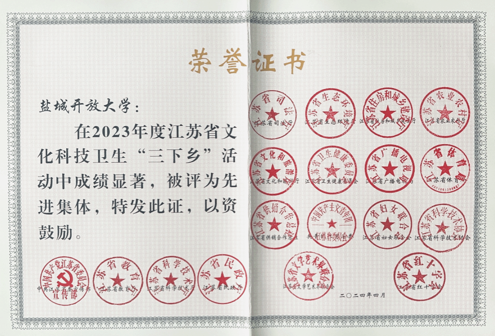 近日,省委宣传部、省教育厅、省科学技术厅、省文化和旅游厅、省卫生健康委员会等18部门(单位)联合发文,对在2023年度文化科技卫生“三下乡”活动中做出突出贡献的先进集体和先进个人给予通报表扬,盐城开放大学被表彰为2023年度省文化科技卫生“三下乡”活动的先进集体。