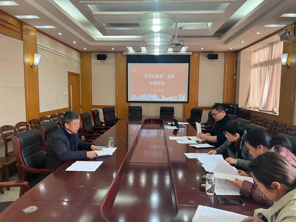 12月1日上午在图书馆301会议室,培训部组织全体成员学习教育部办公厅印发《普通高等学校举办非学历教育管理规定(试行)》和《继续教育学院非学历教育培训劳务费用发放办法》,夏金海副院长主持会议并讲话。