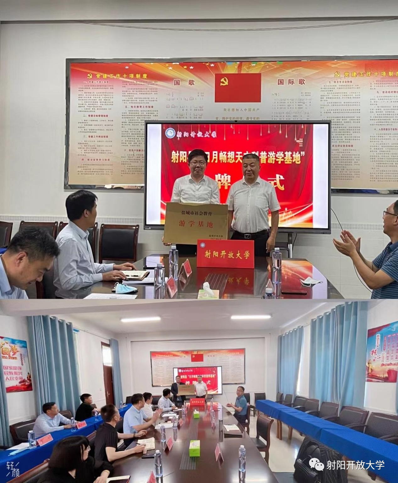 6月7日,我校在射阳开放大学三楼会议室举行市级“游学基地”、“优质项目化基地”授牌仪式。盐城开放大学副校长夏金海、射阳开放大学校长宋扣明等出席仪式。