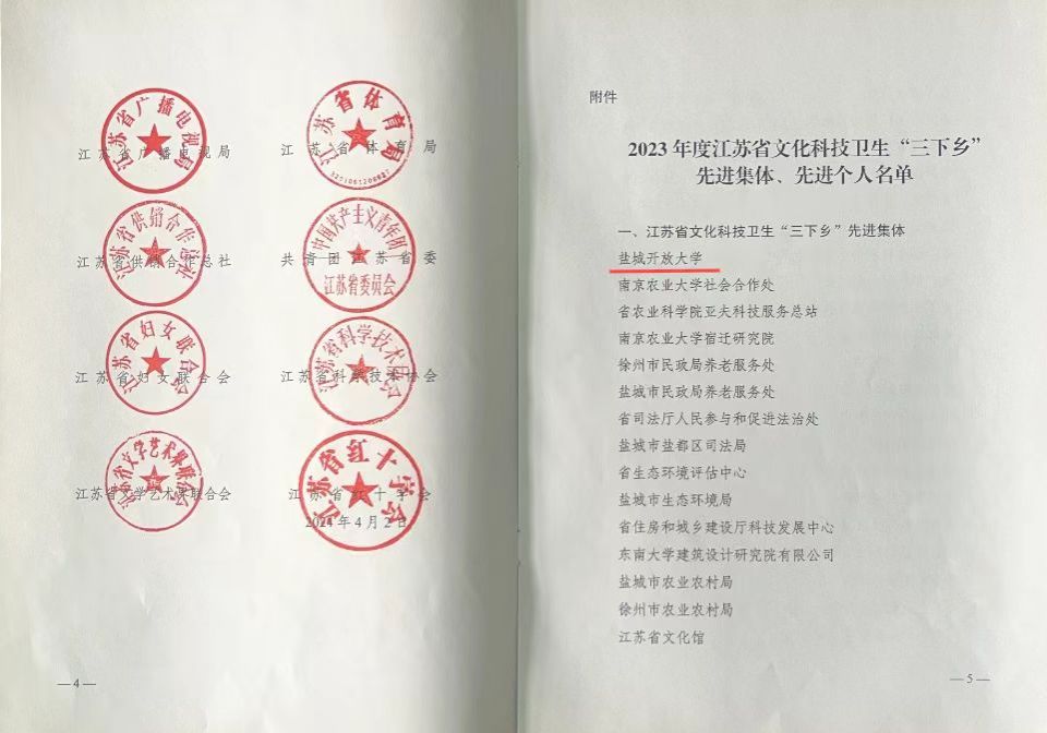 近日,省委宣传部、省教育厅、省科学技术厅、省文化和旅游厅、省卫生健康委员会等18部门(单位)联合发文,对在2023年度文化科技卫生“三下乡”活动中做出突出贡献的先进集体和先进个人给予通报表扬,盐城开放大学被表彰为2023年度省文化科技卫生“三下乡”活动的先进集体。
