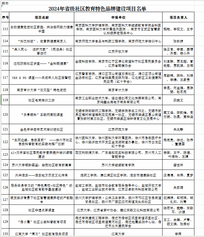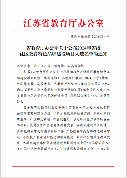 近日江苏省教育厅发布了《关于公布2024年省级社区教育特色品牌建设项目入选名单的通知》,由我院牵头申报的《服务终身学习的“特色高校+社区特色”的盐城社区教育数字基座建设》项目成功入选。
