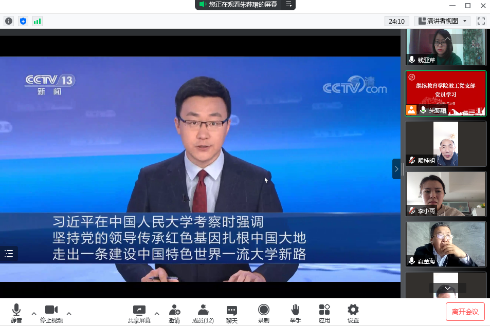 4月29日上午,学院教工支部通过云端开展全体党员政治学习。支部书记朱荪珺主持。